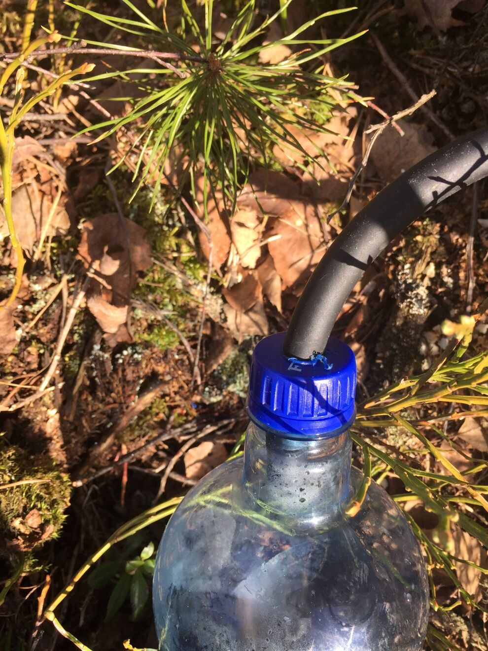 Her er mamma sin "tappestasjon". Hun lagde et lite borrehull inn i Bjørka, og stakk inn denne slangen. Så borret hun et hull i korken på flaska og så fylles den opp av seg selv.
