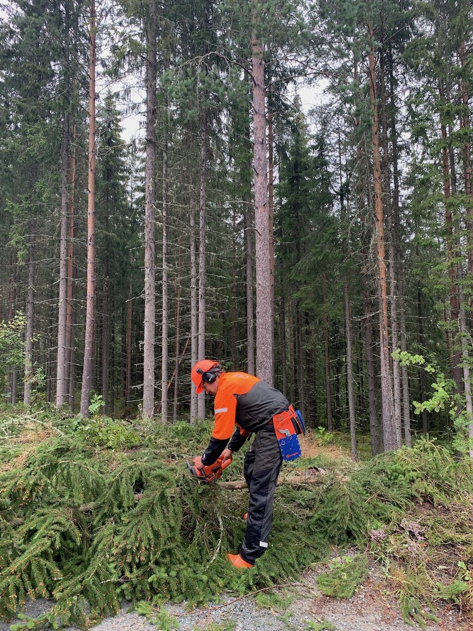Selv om duken ble sydd i sin helhet der oppe, var det mange andre ting som også måtte på plass. Her kutter Kristoffer trær i passe lengde og tykkelse til å være gode stokker.